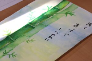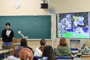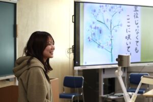 今回は、「表現」と「鑑賞」を関連づけた指導をテーマに、作品制作と作品発表ならびに作品鑑賞といった一連の活動を行いました。昨年の12月に「美術館と学校の連携」をテーマにゲストティーチャーとして芦北町立星野富弘美術館学芸員の方をお招きし、その際に講話を通して星野富弘さんの詩画作品についても学びました。今回の授業では、その内容に関連して、学生一人ひとりが冬休みの課題として取り組んだ詩画作品を発表するとともに鑑賞会を実施しました。