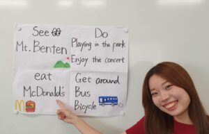 Students in the Advanced Communication 2 course introduced their hometowns. Each student told us what we can do, what we can see, what we can eat, and how to get around if we visit their hometown. Students had to do the following in their presentations: